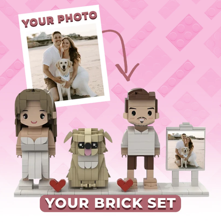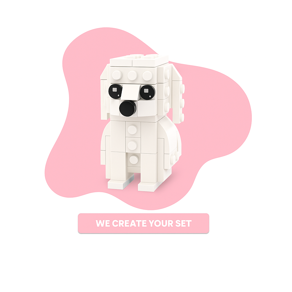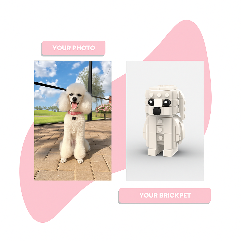 Each kit includes all required bricks, step-by-step instructions, a custom printed cover page with your pet’s name, and packaging designed for gifting.
